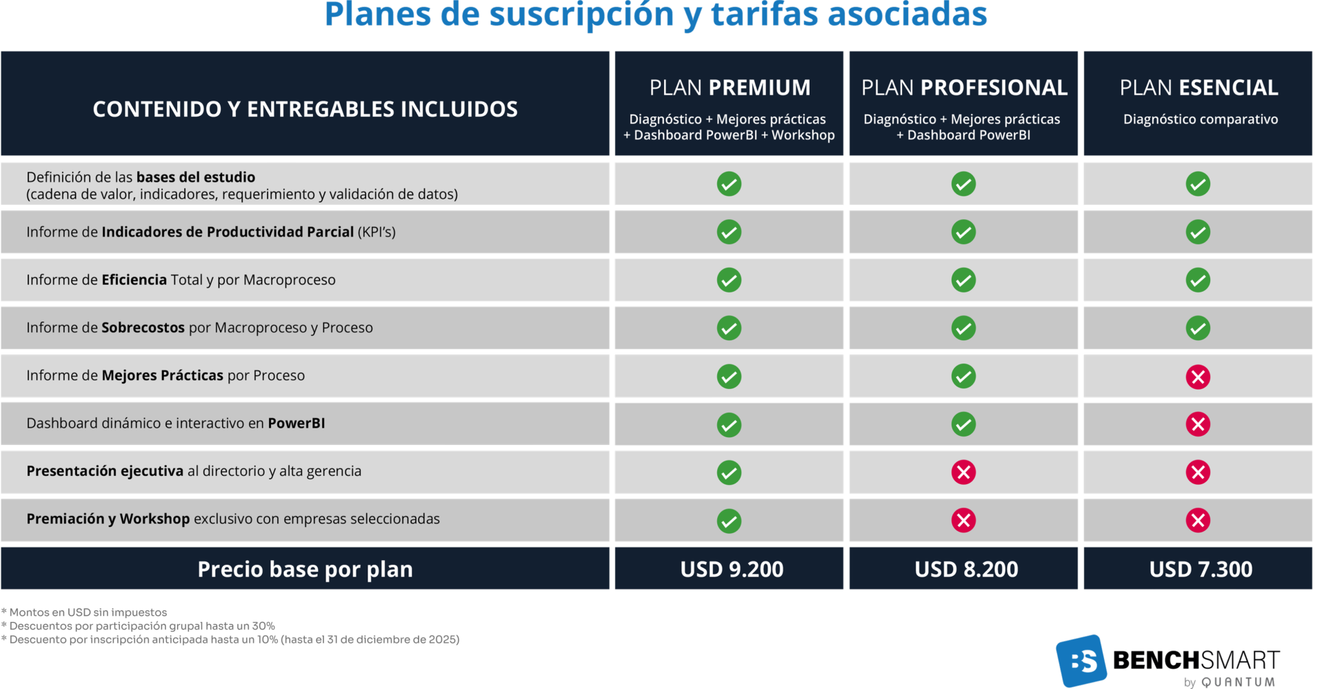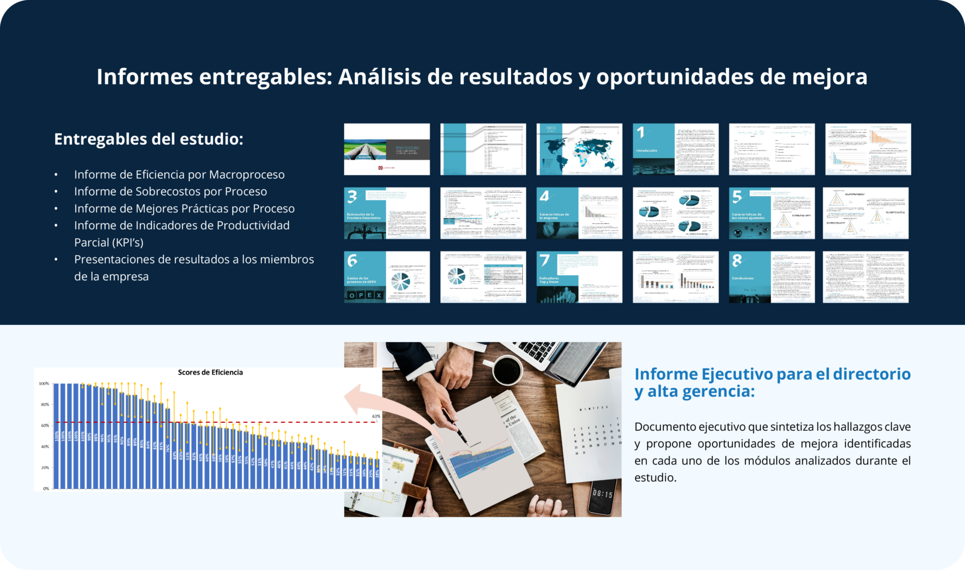 • Compara desempeño en eficiencia, KPIs y buenas prácticas entre empresas.